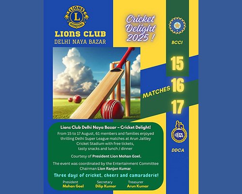 From 15 to 17 August, 61 members and families enjoyed thrilling Delhi Super League matches at Arun Jaitley Cricket Stadi... From 15 to 17 August, 61 members and families enjoyed thrilling Delhi Super League matches at Arun Jaitley Cricket Stadium with free tickets, tasty snacks and lunch/dinner. Three days of cricket, cheers and camaraderie! Read More28 Aug 2025